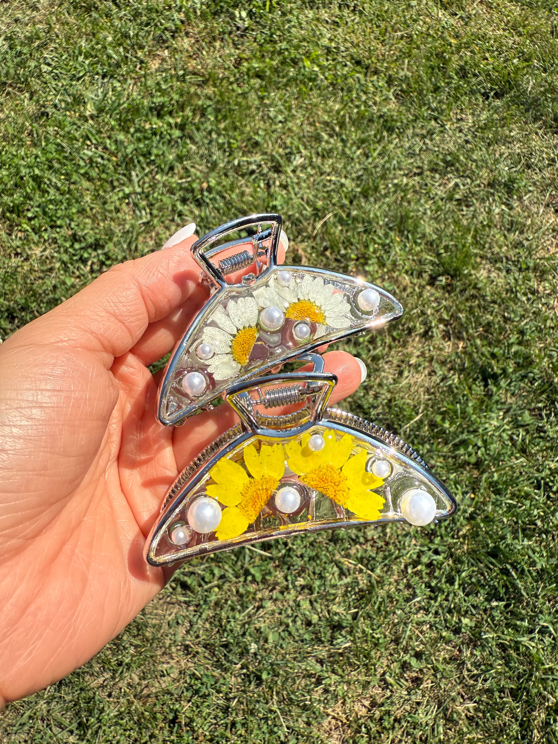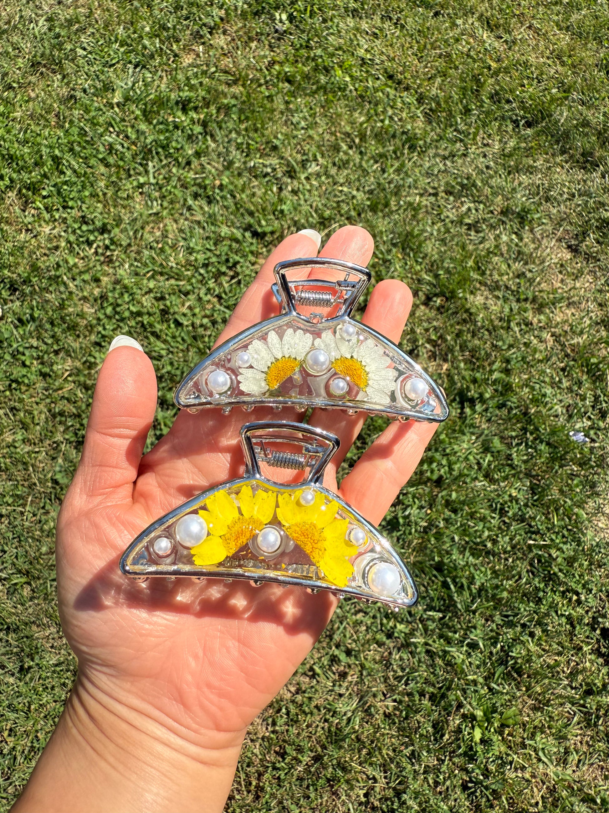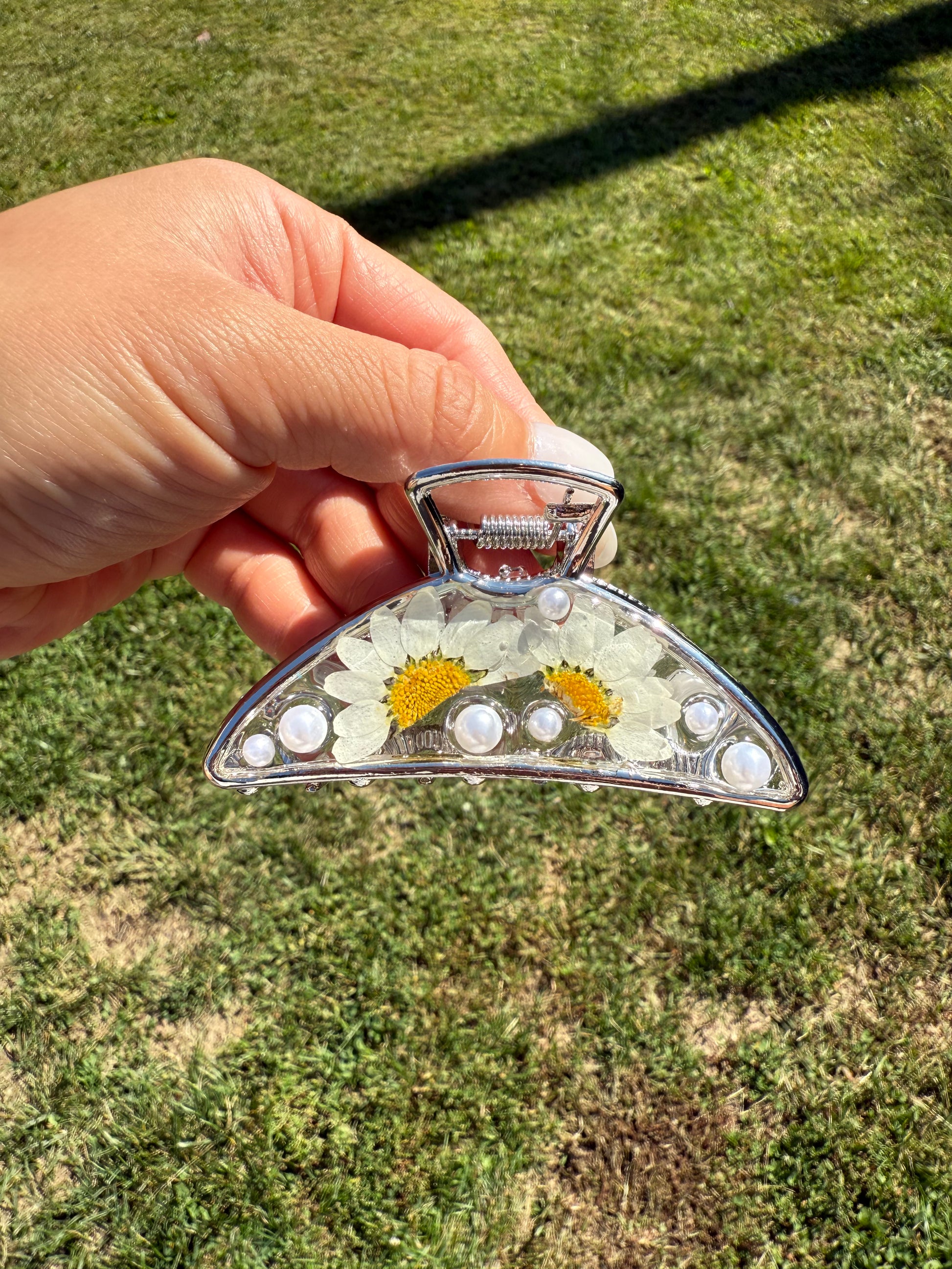 Beautiful floral pearl claw clips. Choose between 12 daisy colors. Flowers are all real dried daisies.