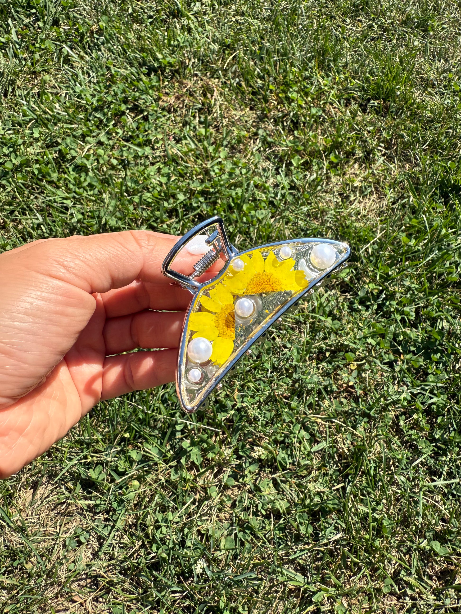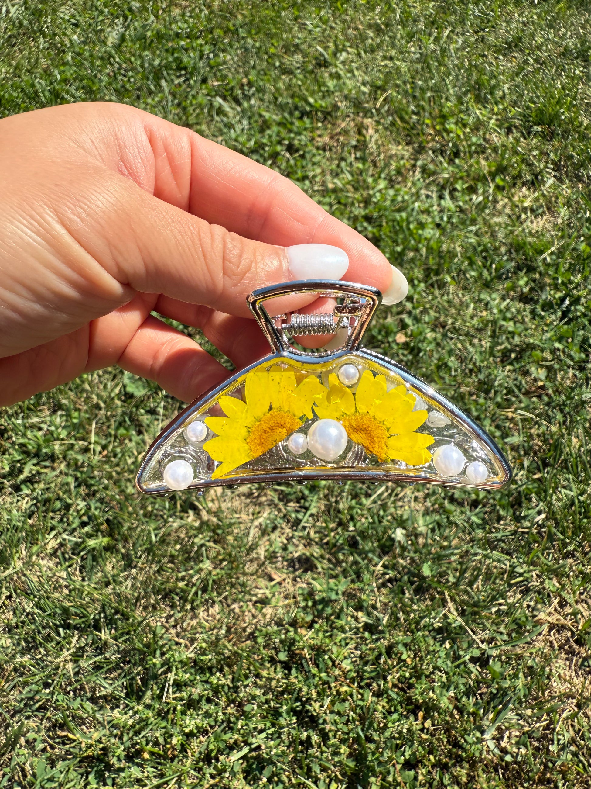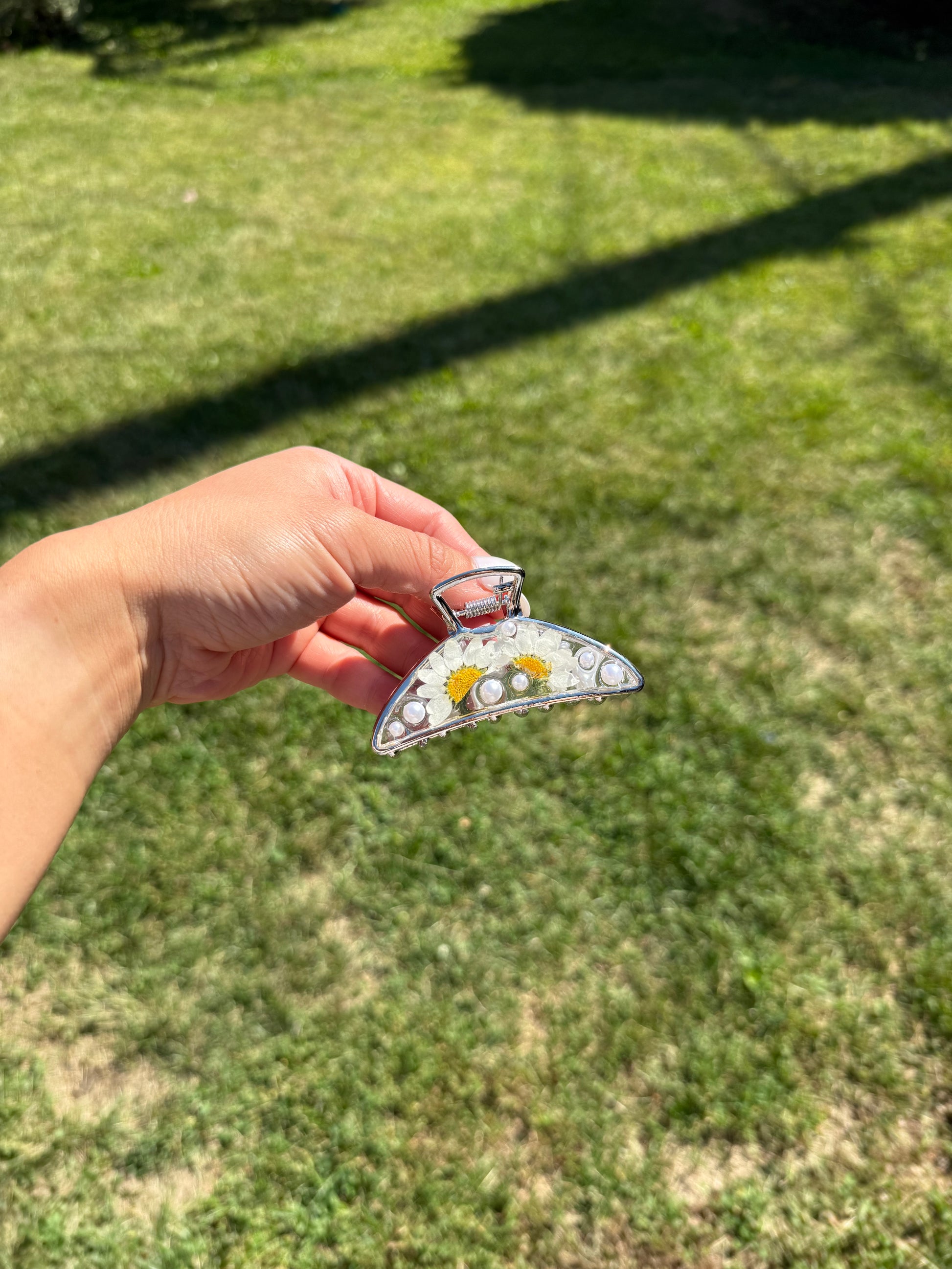 Beautiful floral pearl claw clips. Choose between 12 daisy colors. Flowers are all real dried daisies.